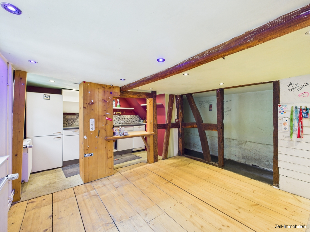 Im Erdgeschoss befinden sich der Wohnbereich sowie die Küche. Die Deckenhöhe im Erdgeschoss beträgt ca. 1,80 m. Die vorhandenen Holzdielenböden unterstreichen den ursprünglichen Charakter des Fachwerkhauses und schaffen eine wohnliche Atmosphäre.