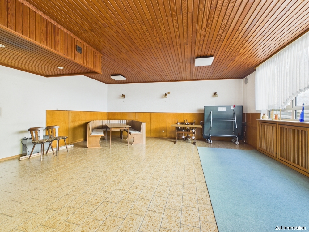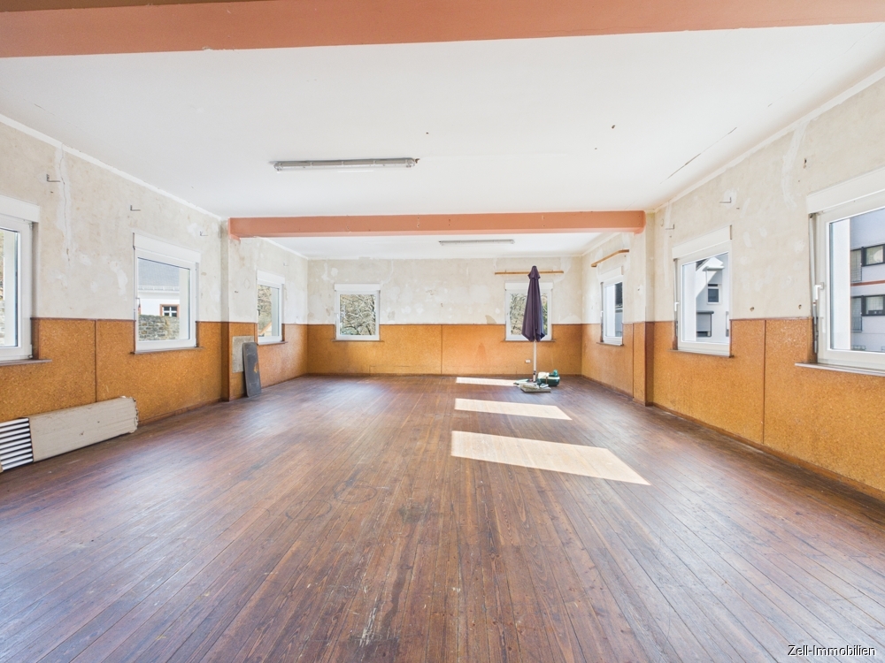 Herzstück ist die Gaststätte mit dem großzügigen, hellen Saal, der sich ideal für Veranstaltungen, Atelier, Lagerfläche oder eine zukünftige Umnutzung eignen würde. Ergänzt wird diese Ebene durch eine Küche sowie zwei separate WC-Anlagen.